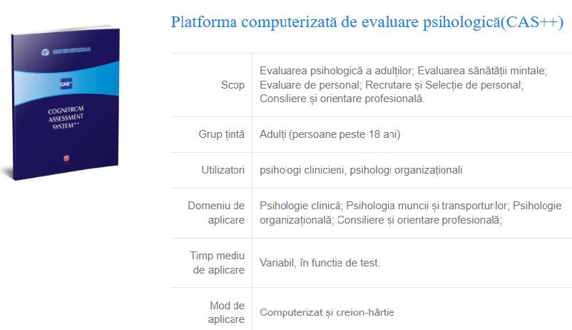 Peste 50 de teste psihologice adaptate și etalonate pe populația din România, grupate în cinci categorii principale: